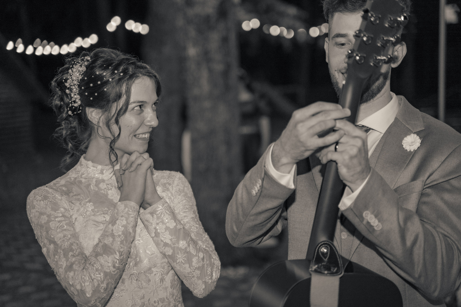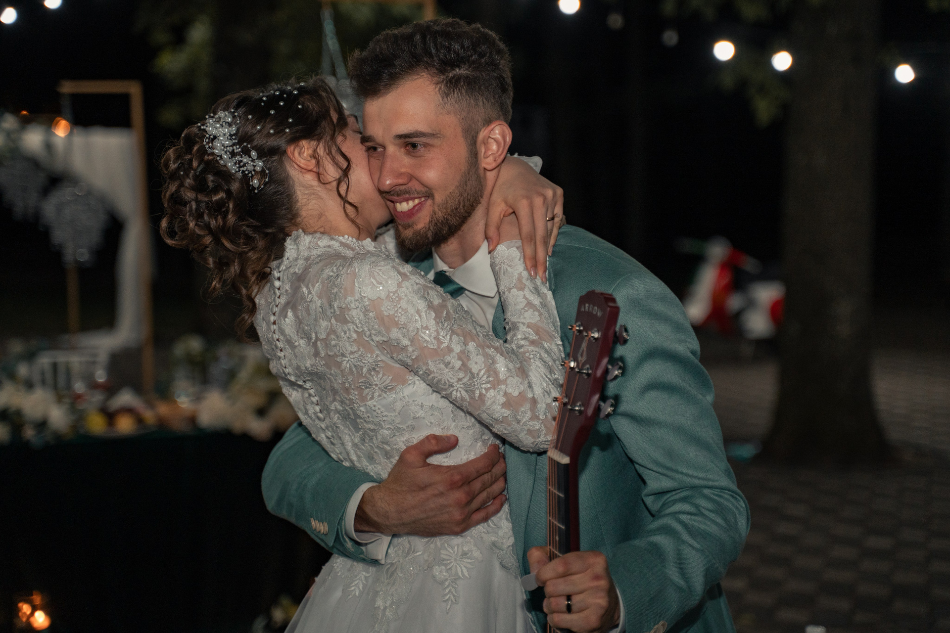 Recunoștință și fericire. O îmbrățișare caldă după momentul muzical, sub cerul înstelat al petrecerii.