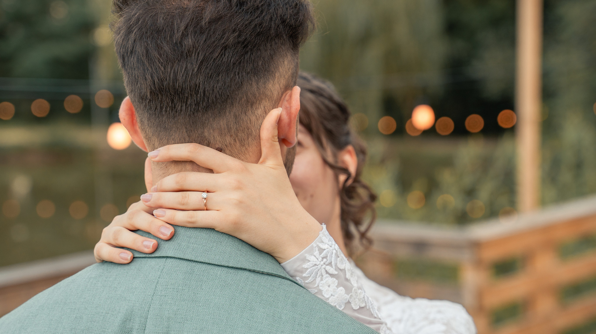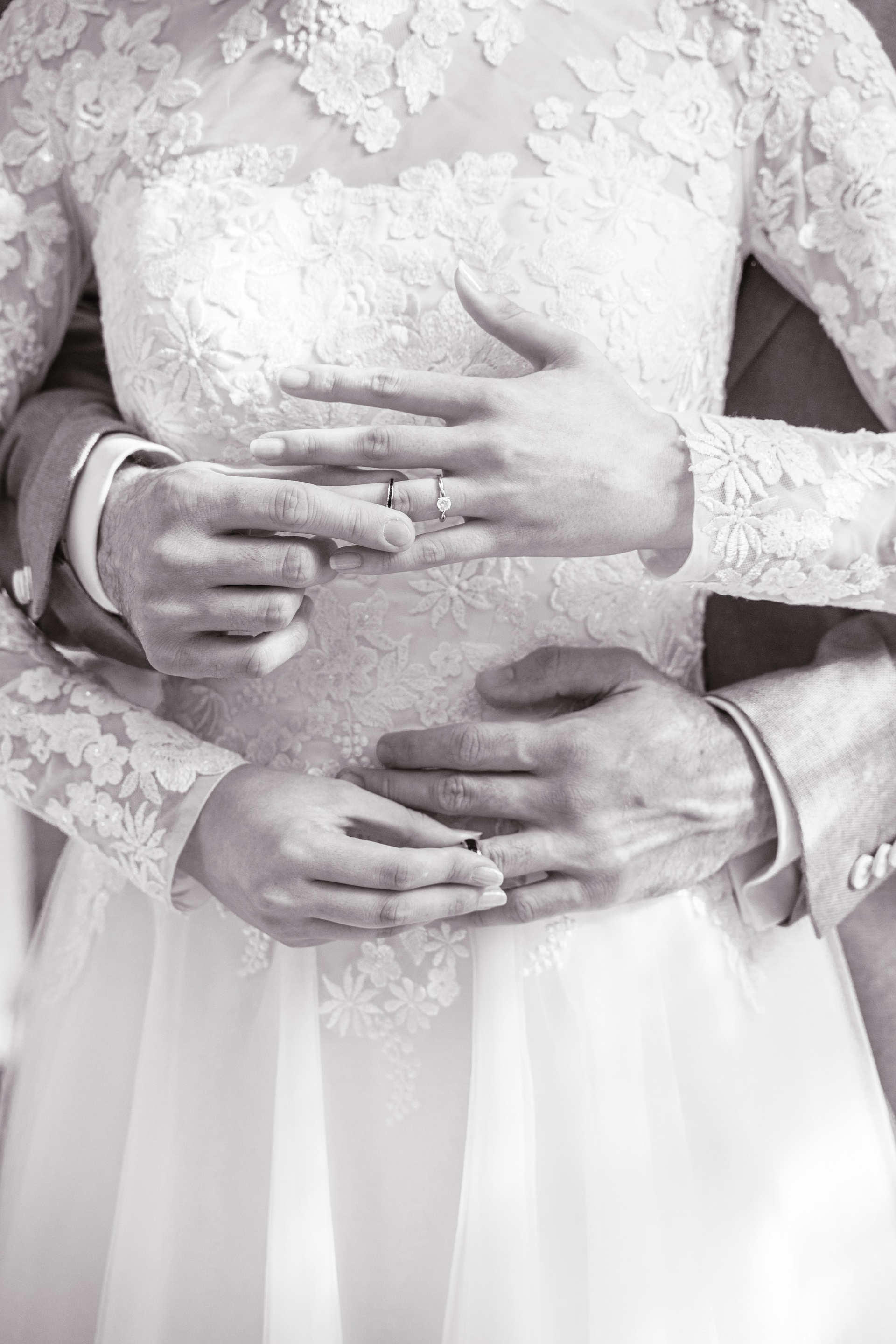 Îmbrățișarea verighete. Un detaliu cald ce pune în evidență inelul de logodnă și siguranța brațelor partenerului.