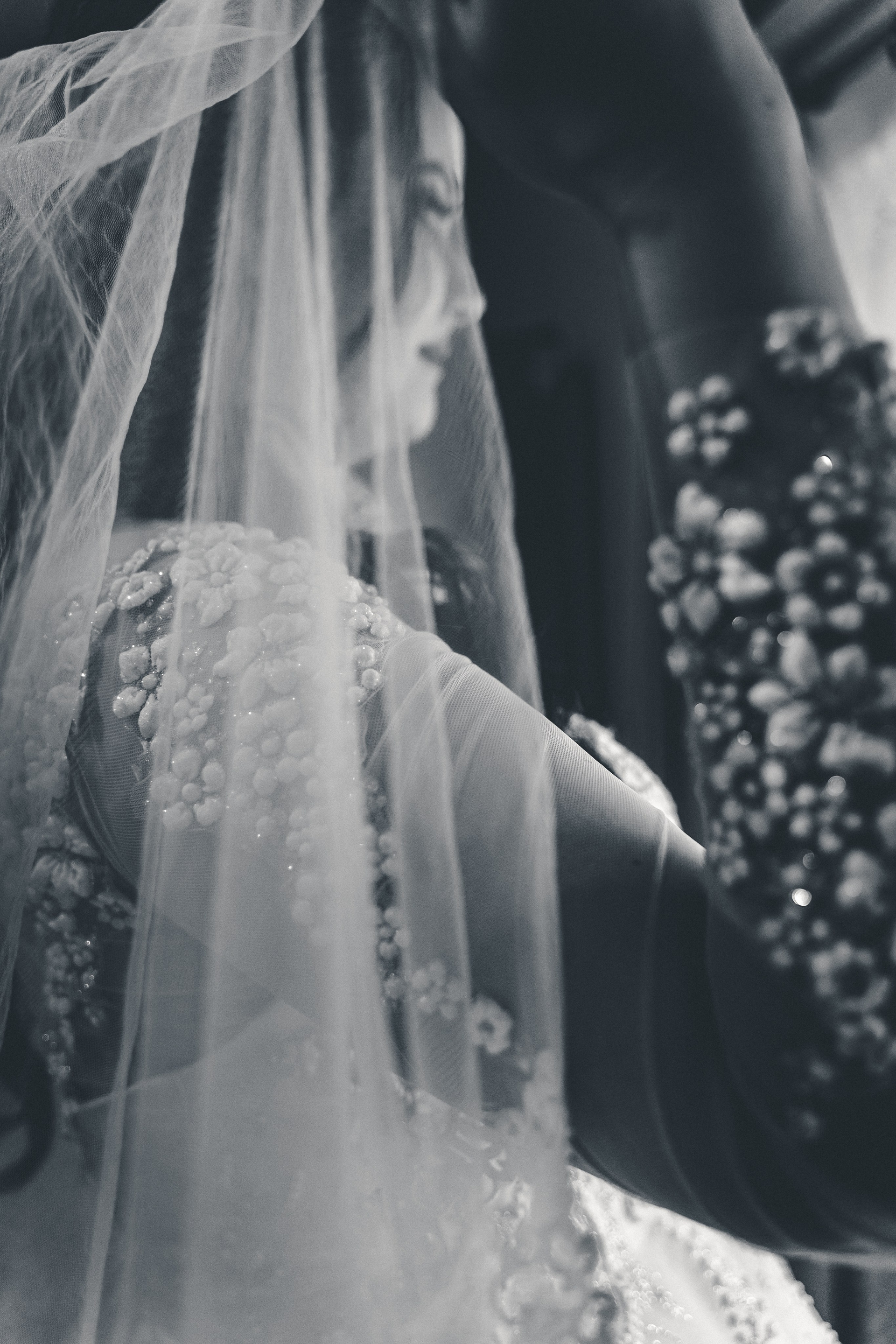 Finețea detaliilor care fac diferența. Un cadru artistic ce pune în valoare textura vălului și broderia florală tridimensională a rochiei de mireasă.
