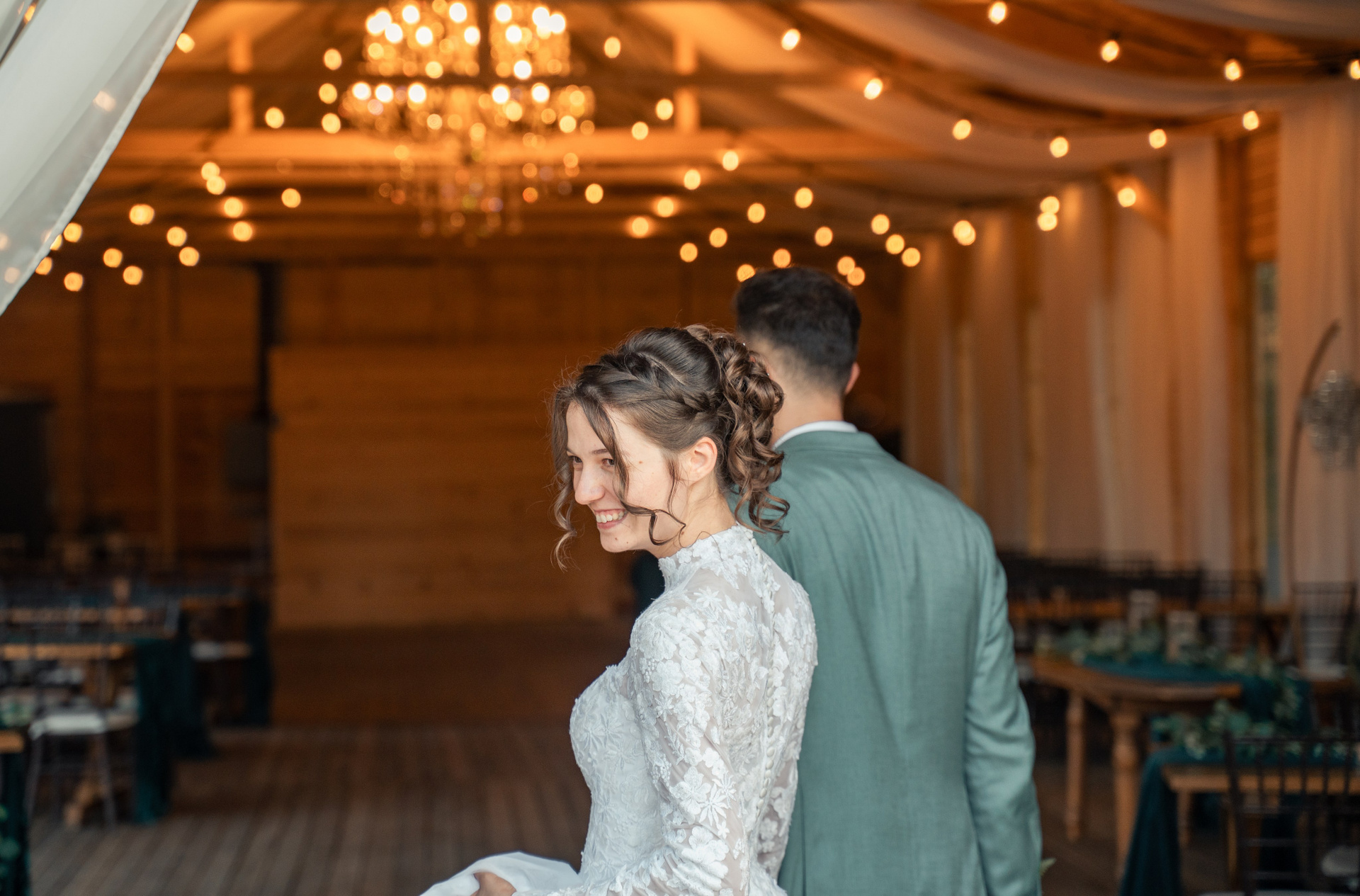 O îmbrățișare plină de liniște. Lumina caldă a ghirlandelor conturează profilul unui moment intim în timpul dansului.