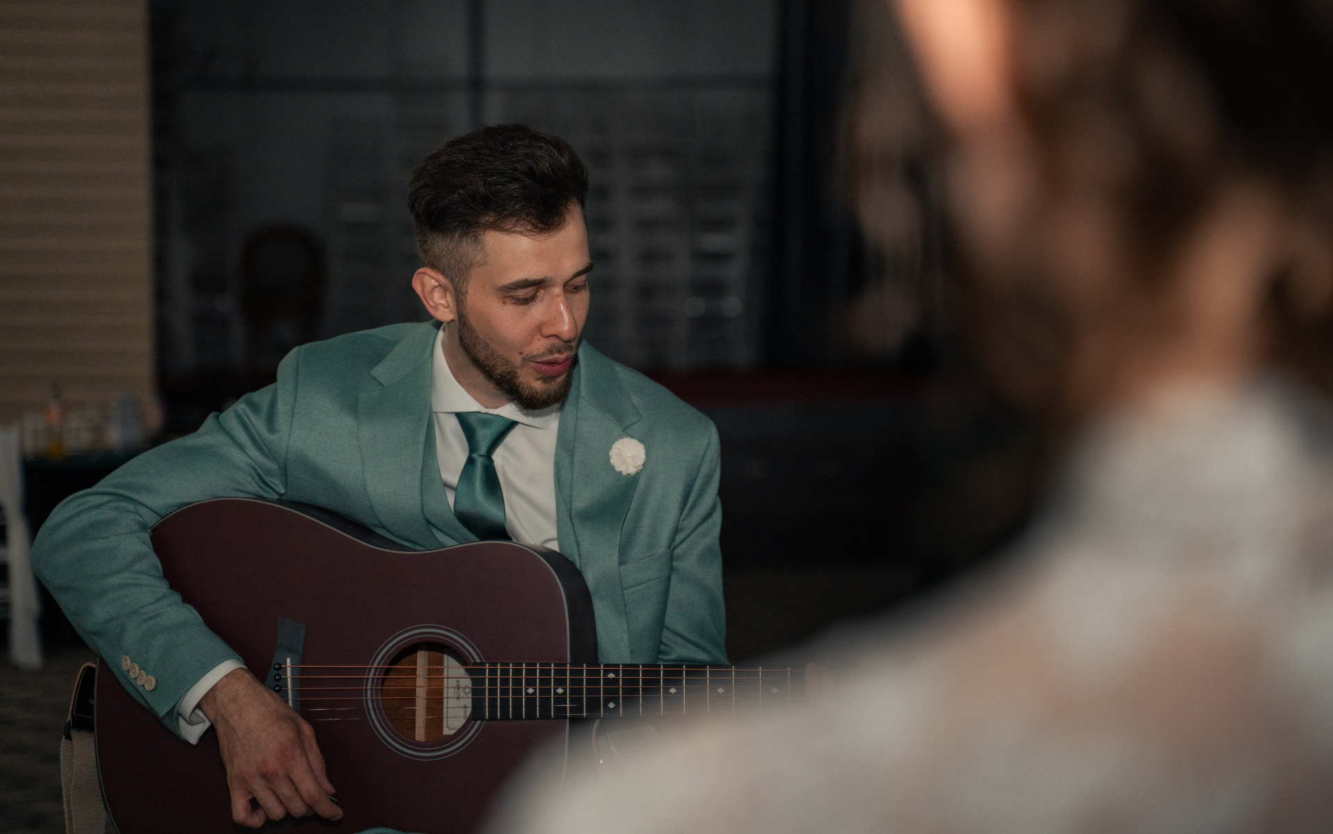 O serenadă pentru suflet. Mirele surprinde invitații și mireasa cu un moment muzical plin de sensibilitate.