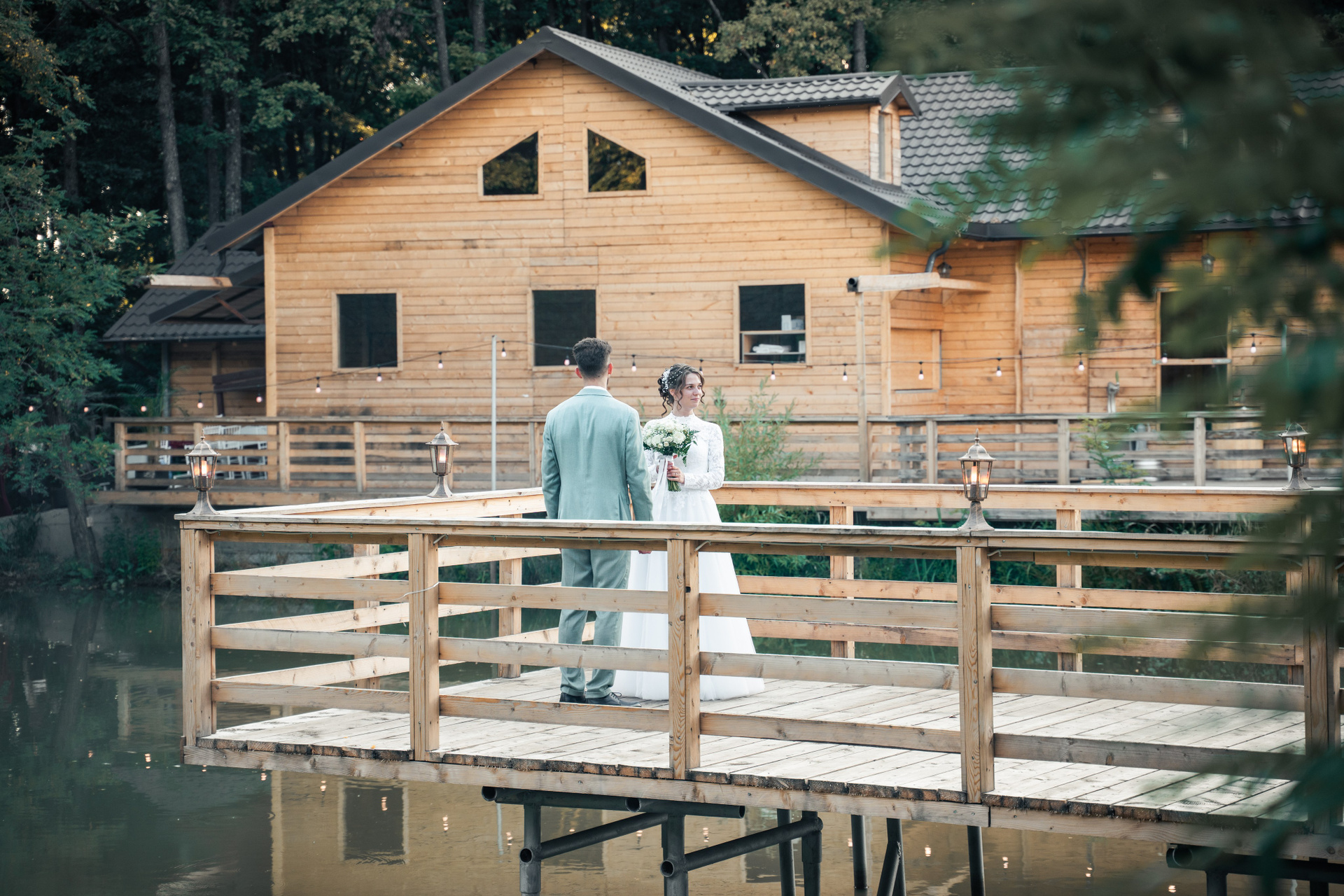 Un moment de liniște pe pontonul lacului, unde arhitectura rustică a cabanei completează peisajul unei nunți de poveste.