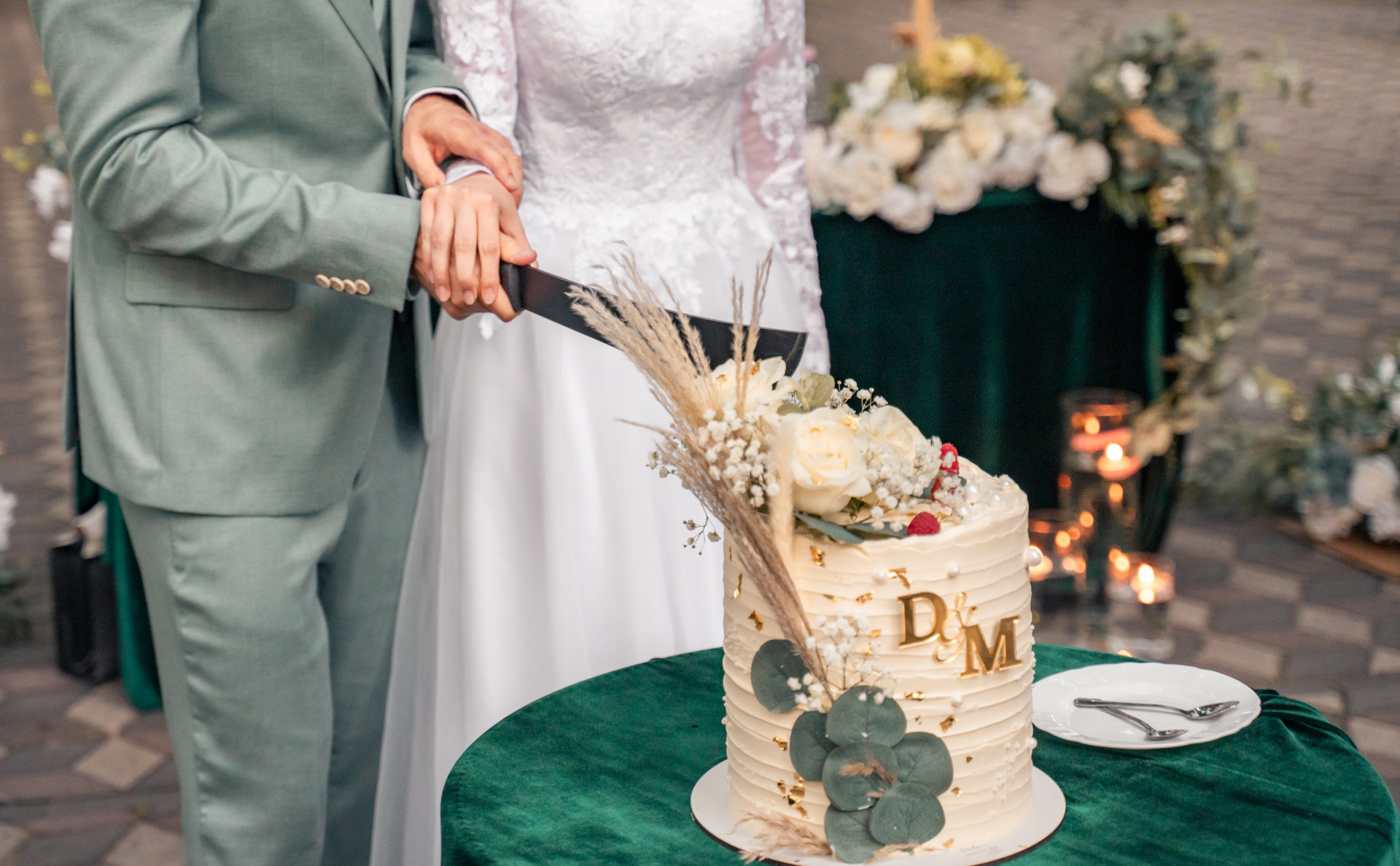 Dulceața unui nou început. Tăierea tortului, un moment de celebrare decorat cu accente botanice și inițialele mirilor.