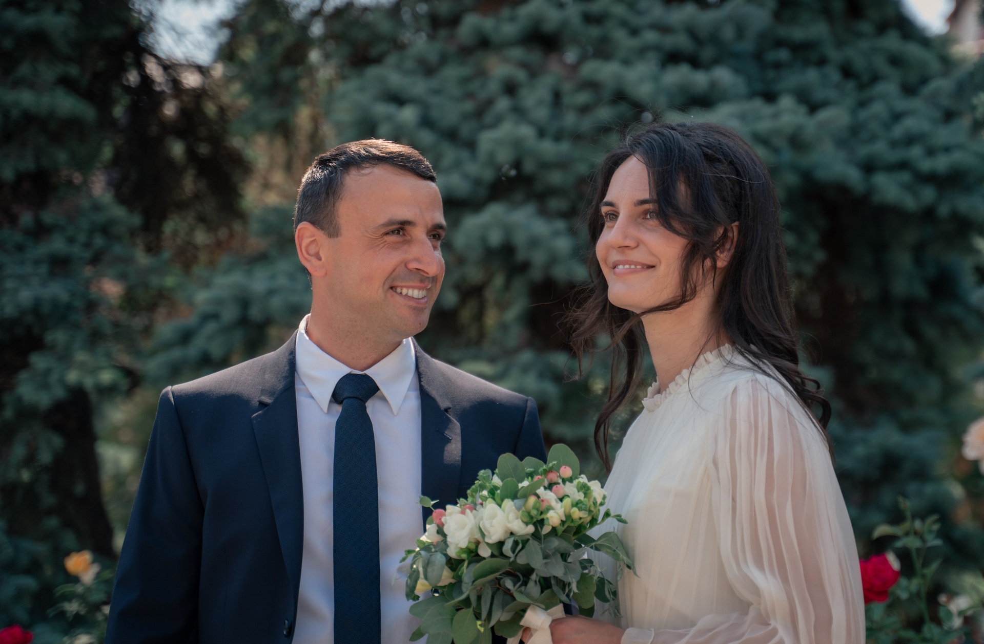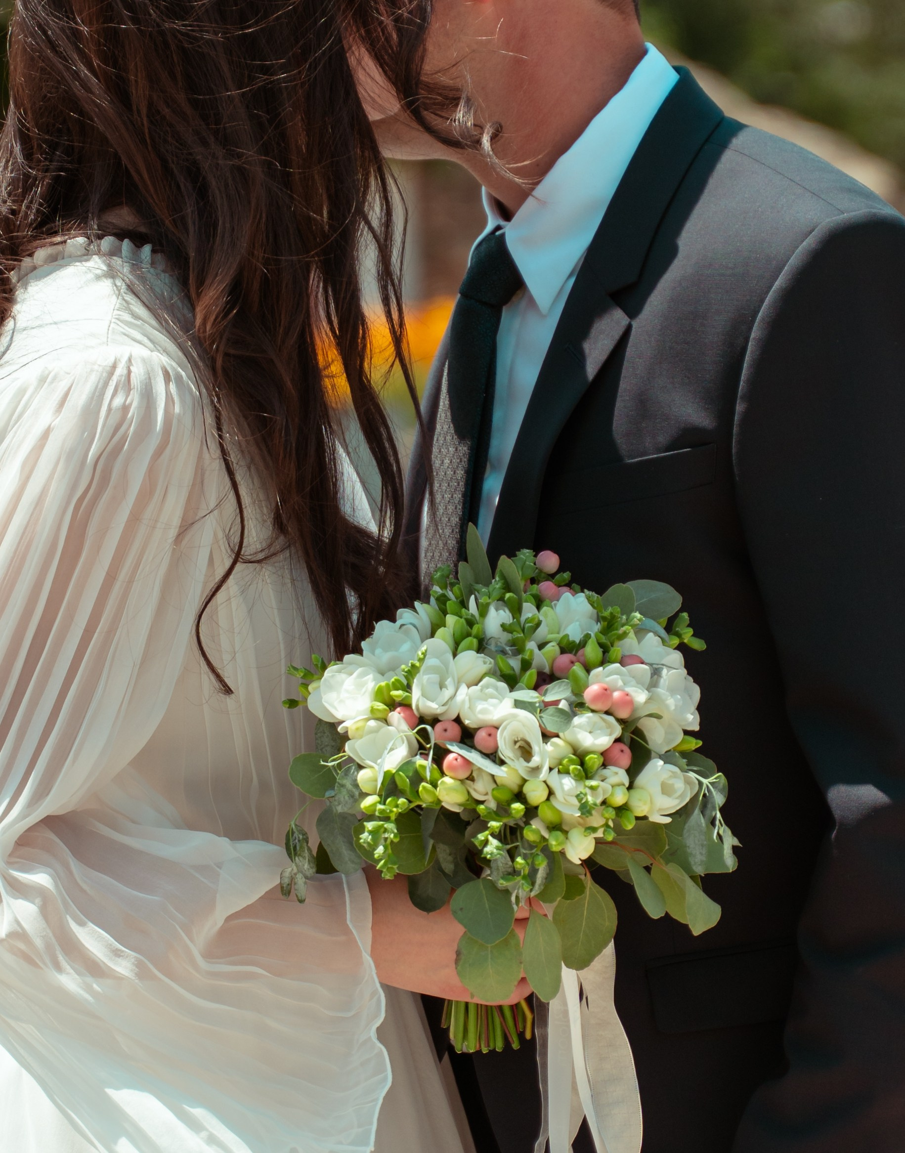 Sărutul discret din spatele florilor. Un moment de tandrețe pură, unde buchetul de frezii devine martorul unei noi promisiuni.