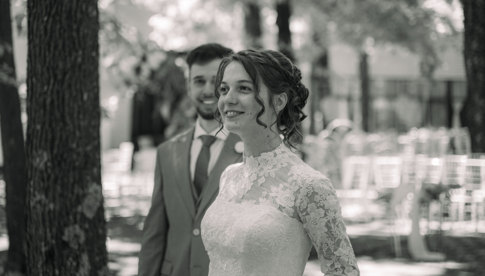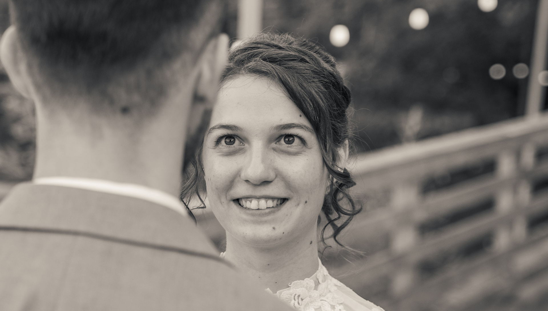 Admirație pură. Mireasa privește cu dragoste și entuziasm spre mirele său, într-un moment candid alb-negru.
