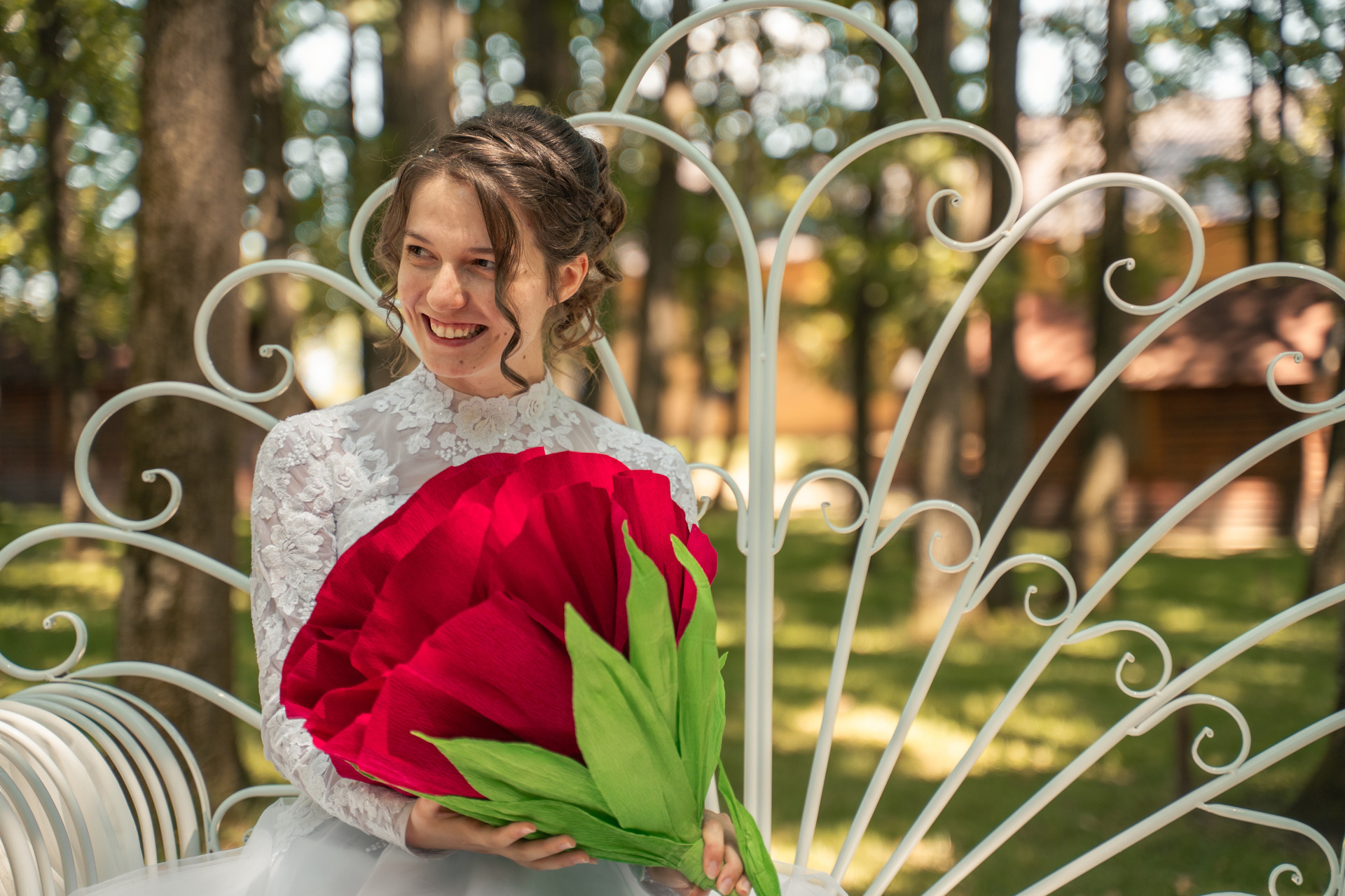 Contrastul dintre emoție și mărime. Un moment ludic între miri, unde un buchet neconvențional devine pata de culoare a unei zile de neuitat.