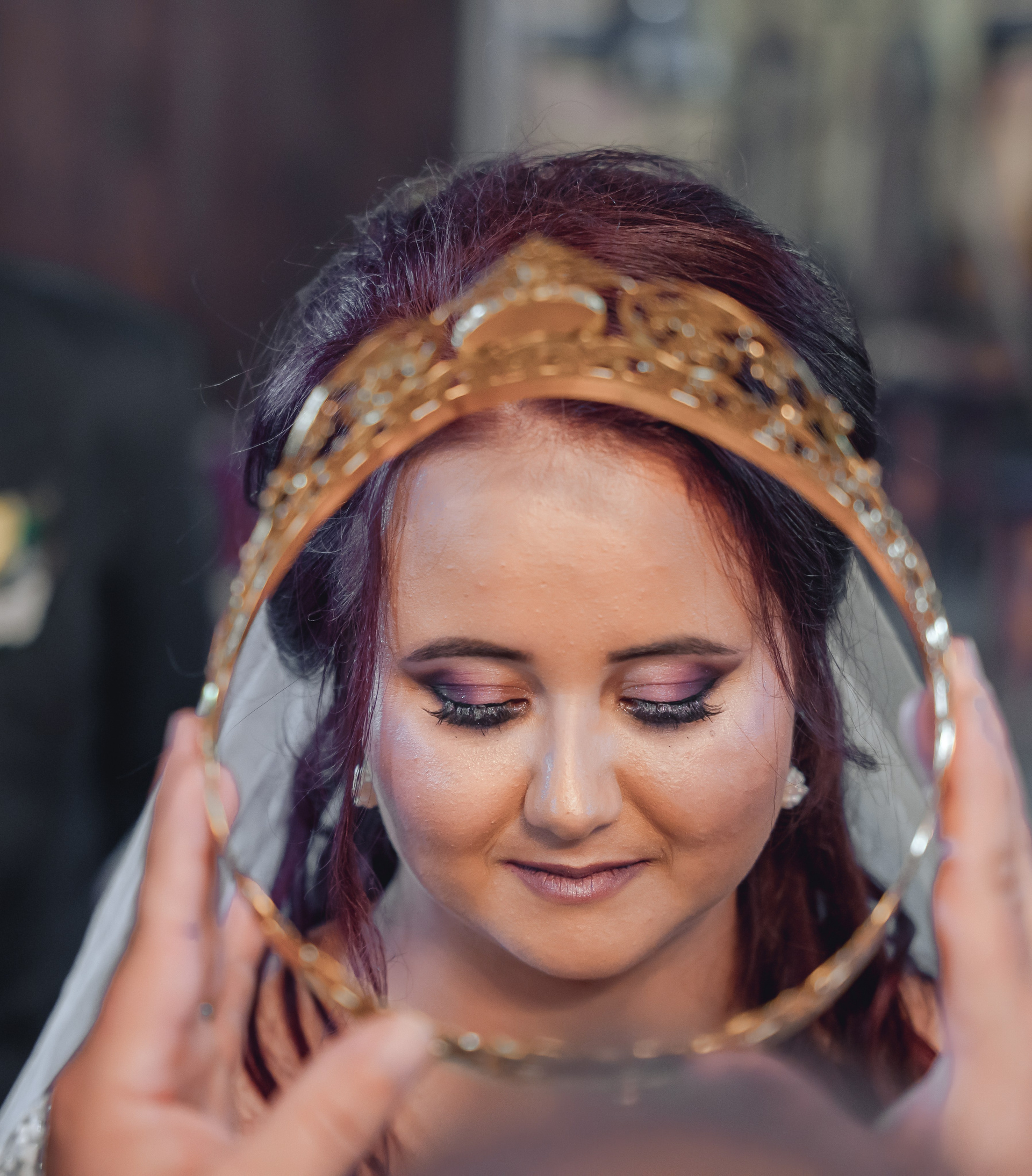 Momentul solemn al cununiei. O privire plină de liniște și însemnătate, încadrată de tradiție.