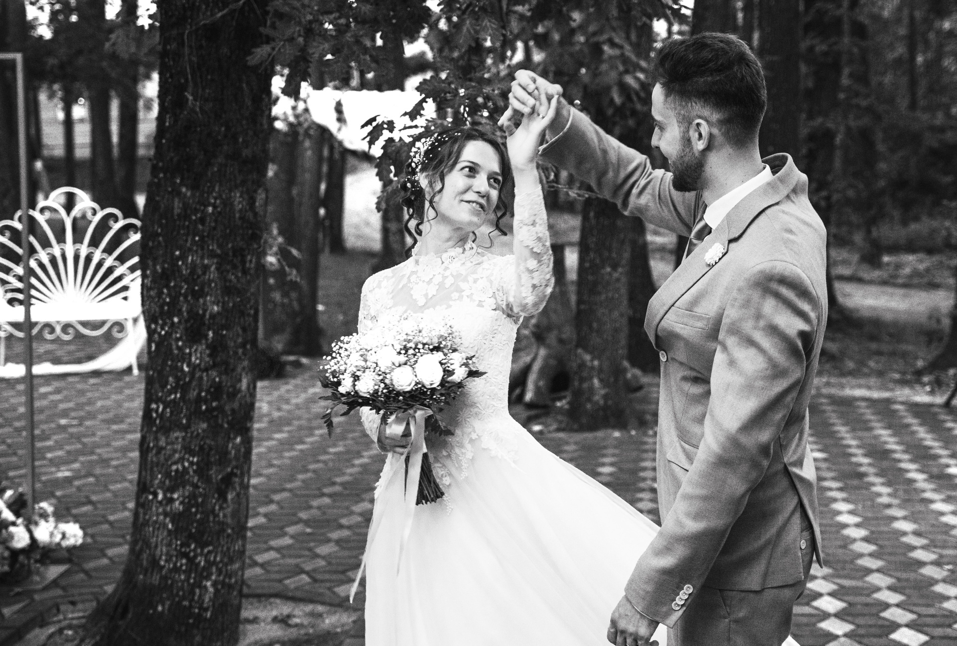 Dansul iubirii sub cerul liber. O captură plină de dinamism ce transmite energia și fericirea primului dans.