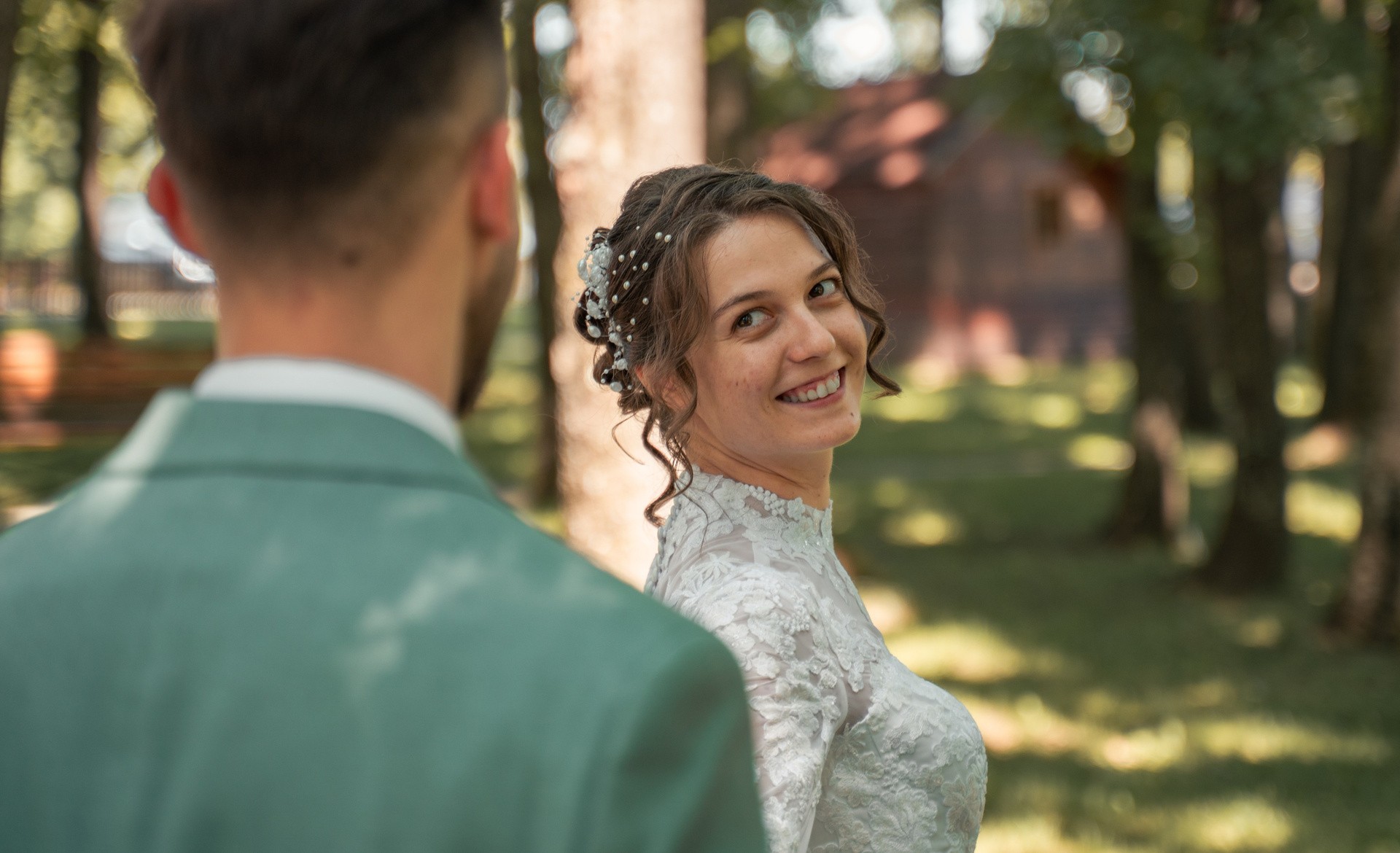 Pășind împreună spre seară. Detaliul spatelui rochiei cu nasturi delicați și coafura sofisticată completează un look de mireasă memorabil.